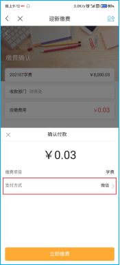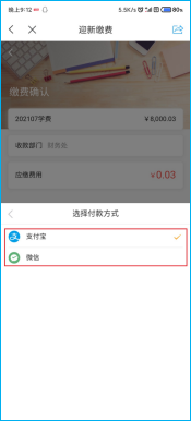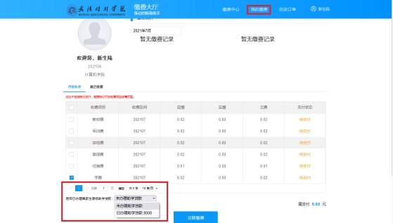 步骤五:点击我的缴费,全选后可以缴纳全部费用(办理助学贷款学生的可选择助学贷款抵扣选项)。